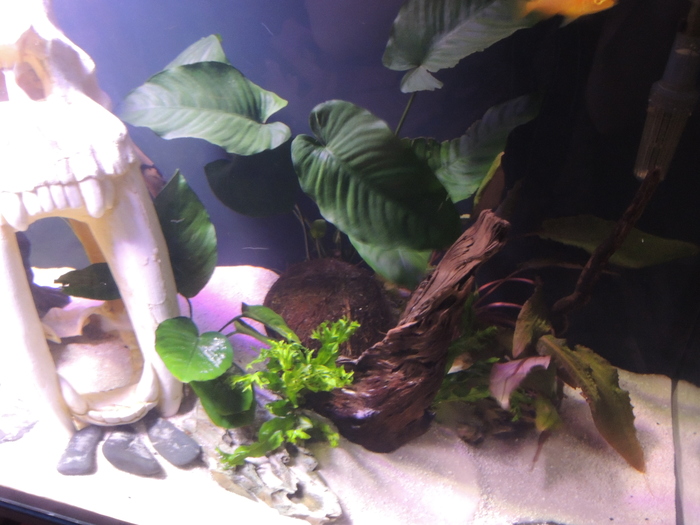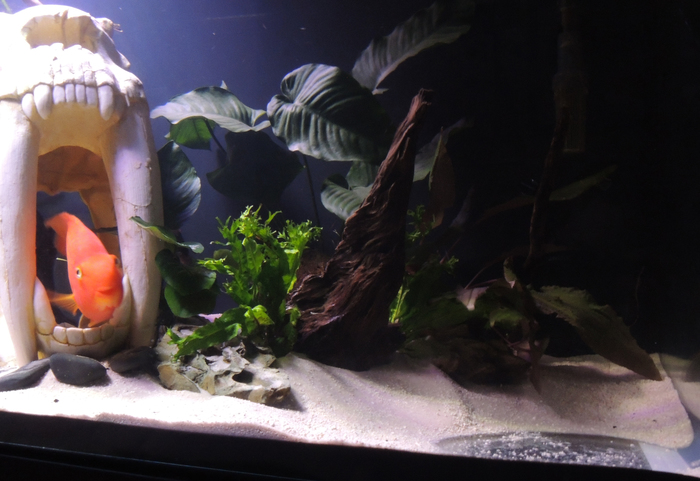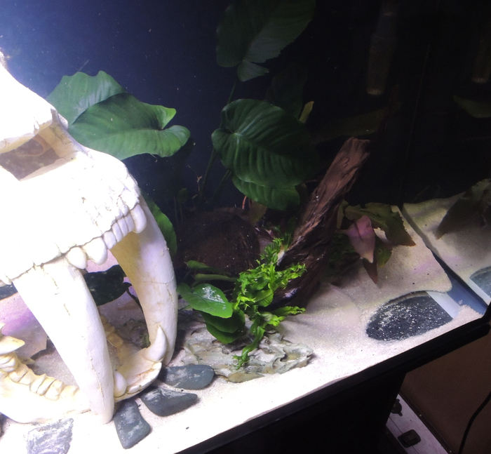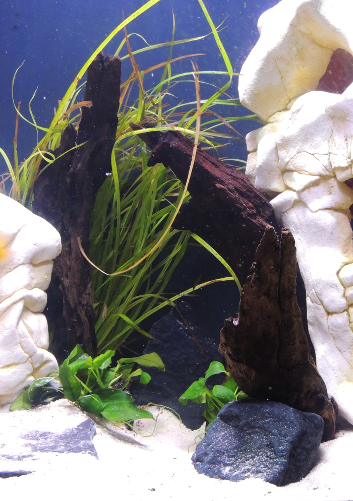 Здесь я запустила маленьких анциструсов, чтобы чистили от водорослей декорации. Но со своей задачей они не справились, в довесок еще и исчезли. Грешу на цихлид, которые видимо их слопали за милую душу.