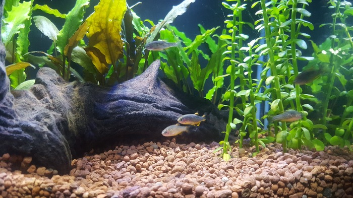 2. Вчера вечером при кормлении, при включенном свете даже агамиксисы выплыли и жадно начали есть, я так понимаю они были крайне голодные. При кормлении, моллинезии и данио едят с дикой скоростью, все что попадает в аквариум ( хлопья, мороженный мотыль, гранулы для сомиков ( давалось естественно в разные дни)). От корма не остаётся и следа за 2-3 минуты. Вопрос в как кормить, чтоб всем доставалось. Лялиусы боязливые, подъезжают крошки, а агамиксисам походу вообще ничего не достаётся.