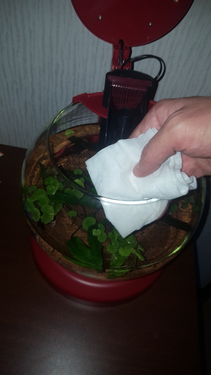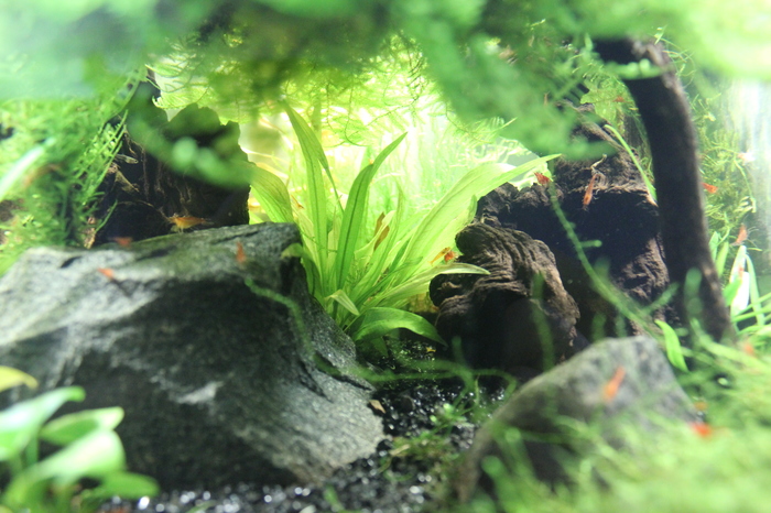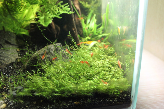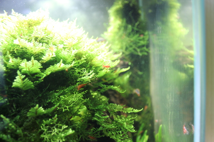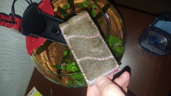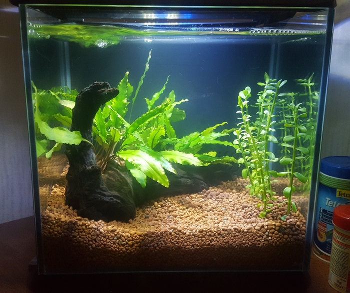 Самодельный внешний фильтр отлично справляется с возложенной на него нагрузкой. Растения растут. Дерево заросло + еще риччия разлетелась и прорастает то тут, то там, в планах убрать риччию совсем, а-то, такими темпами, она захватит все пространство. Дерево надо подстричь, т.к. разрослось очень мощно. Но на подходе покупка аквариума 150 литров, может быть дерево в него и переедет, поэтому ничего не трогаю. В "газон" из мха феникса затесался мох стринг, зараза та еще, надо выдергивать, в следующую подмену воды почищу, но феникс пророс отлично, пластиковой основы почти не видно уже, через месяц должен быть отличный коврик из мха.