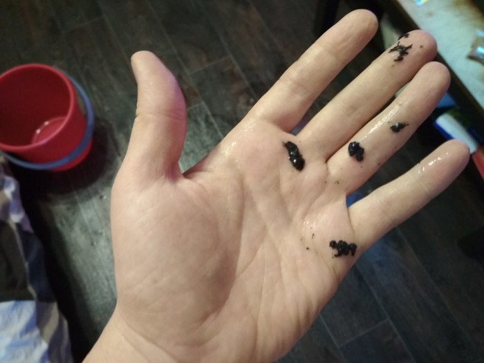 Сильный запах застоявшейся воды,  тины, обнаружены большие сгустки чёрной слизи. Это та самая чёрная борода?