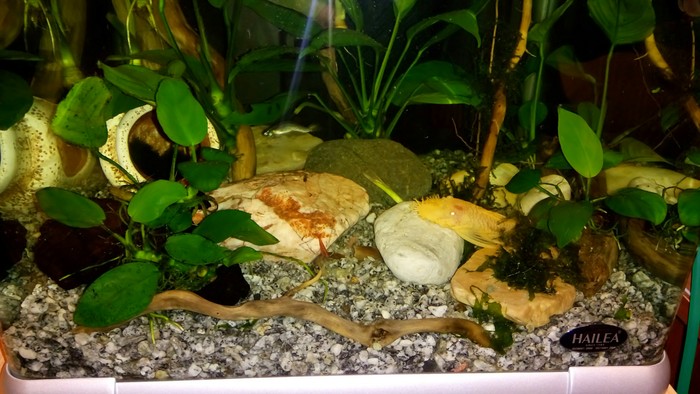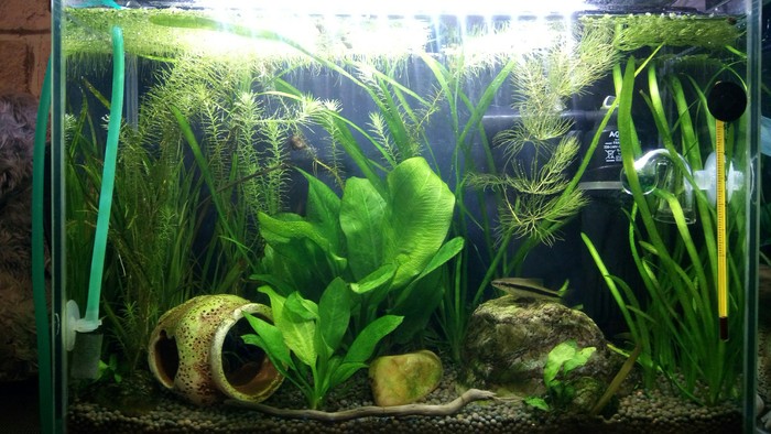 И некоторые проблемы в маленьком сейчас - на майяке растёт длинная водоросль, вроде нитчатка😞 и пока единственный вариант избавится от нее, удалить майяку вовсе. Проверка параметров еженедельно - норма, освещение- лампа немного мощновата, меры: укороченный световой день и на поверхности - ряска и циперус дают полутень. Подмена воды еженедельно 1\3. Вот убрала майяку и уже неделю не вижу наростов этой пакости. Еще заилился грунт, надо менять грунтоочиститель, сломала, шлангом много не почистить. Камушек в углу от ксенококуса не чищу, хочу выростить бахромку )) но со стенок и декора чищу регулярно.