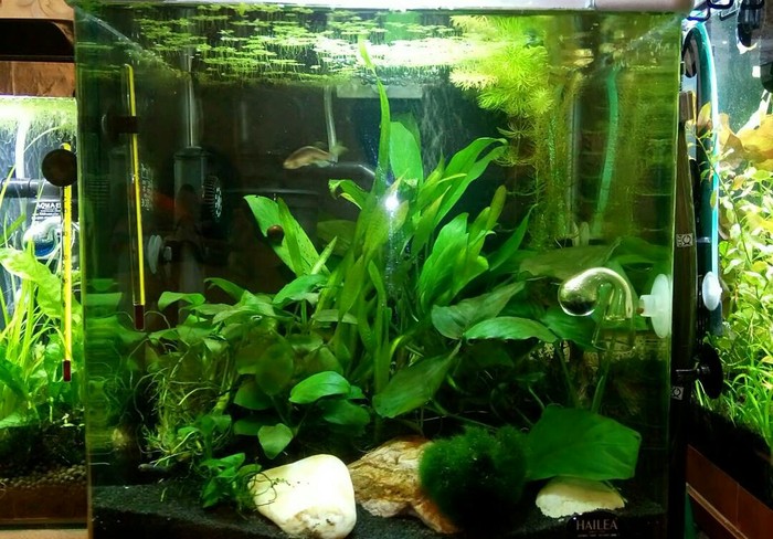 Понятно, что при минимально украшенном растениями аквариум чистится очень даже просто. Опустил сифон в грунт и шурши себе потихонечку))) А если аквариум плотно заселен растениями? Ну тот же анубиас к примеру, если привязан как надо, к камушку или ещё к чему, мы просто достаём и временно помещаем в тазик. А элодея которая высажена в грунт и напускала кучу корешков в этот самый грунт? Да и помимо элодеи, думаю, есть ещё масса растений с корнями заглубляющимися в грунт. Очень жду мнение экспертов в данной области!