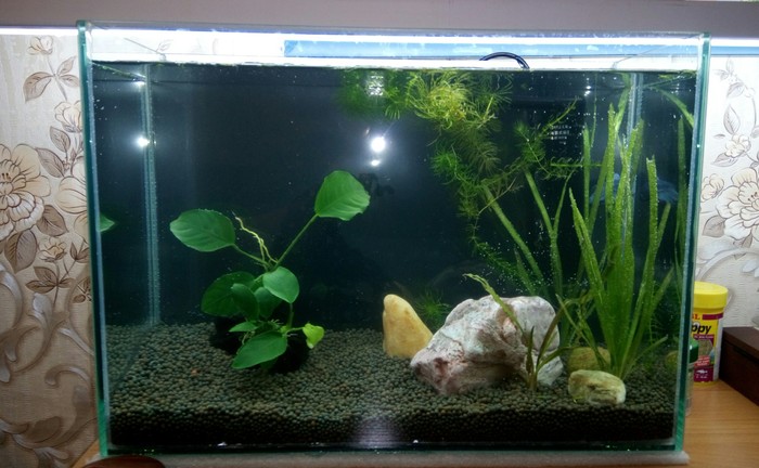 В начале установки была проблема, попался некачественный грунт, сама виновата, не кипятила, и завелись полипы - вывела радикально - все промыла хлоркой и обшпарила кипятком, грунт на помойку. Анубиасы пришлось тоже дезифицировать. Фото на период обнаружения полипов, внизу розовое пятнышко, думала камень, а фиг там. Еще была напасть - мега огромное количество нематод или прочей белой хрени
