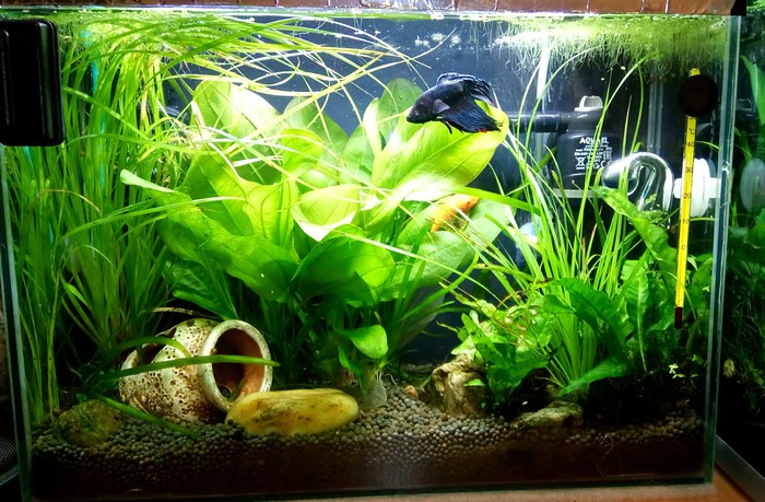 Вообще вариант интересен,только кого туда можно подселить?..мелкие рыбки могут просто вылиться в стакан при смене воды))