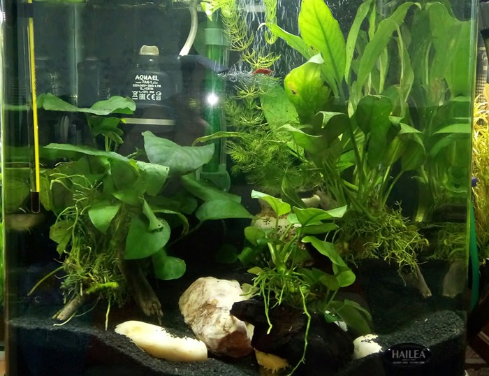 А это уже сегодняшний. Сильно проредила, а то был похож на непролазные джунгли )) Параметры воды близки к идеальным, дропчекер посинел, закончилась бражка. Население 11 штук - гуппи, даньки и "селёдка" сиам.водорослеед. Растюхи - бакопа каролинская и мониера, ротала, аманея грацилис(еле выходила), альтернатера лиловая, папоротник тайландский, людвигии ползучая и дугообразная, нимфея рубин, сагиттария шиловидная, буцефаландра зеленая, гигрокотила белоголовая, криптокорины- желтая, вендта тропика и брауни, уиллиса, балансе, мох печеночный тоже в стадии восстановления, эхонодорусы оцелот и квадрокотус. Улитки - землеройки хоть и перепахали весь грунт, ну и пусть, зато не киснет, а кусочки лавы потихоньку вытащу все. Беда с катушками, не могу никак избавиться от них. Физ уже вывела, но не этих 😞