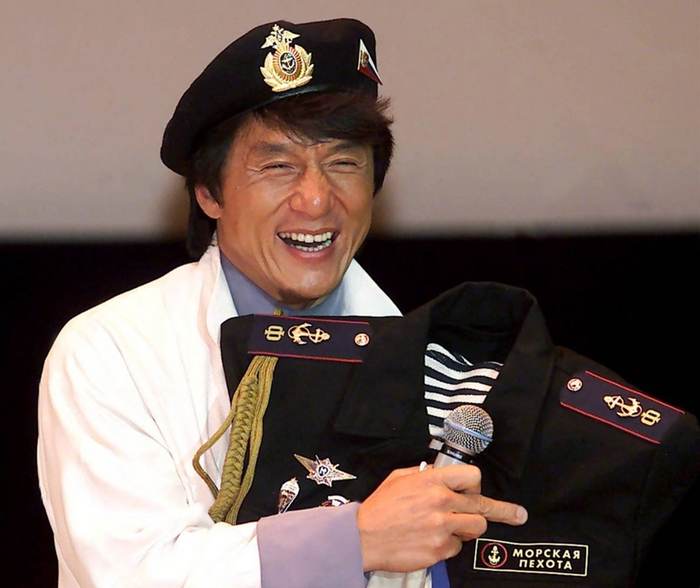 После «нарезки» из фильмов с его участием Джеки Чан отвечал на вопросы из зала. Звезда комедийного кино подтвердил свое амплуа развитым чувством юмора. Джеки как любителю разных форм подарили морской кортик, морской берет и форму и Александровский флаг.Упомянув о хобби актера коллекционировать различную форменную одежду, ведущий вечера Леонид Ярмольник предложил сидящему в зале милиционеру подарить Джеки Чану мундир. После мучительных колебаний поклонник все-таки разделся. И в то время, когда актер и поклонники следовали на торжественный вечер в кинотеатре «Ударник», несчастный голый человек ожидал в фойе «Пушкинского», пока ему привезут одежду, бедный милиционер просидел за кулисами целый час, потом ему вернули его форму, а Джеки подарили новую.