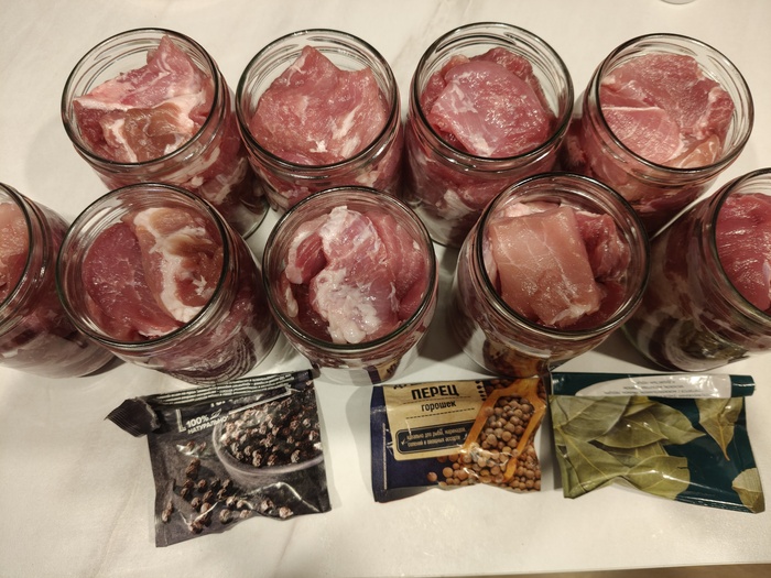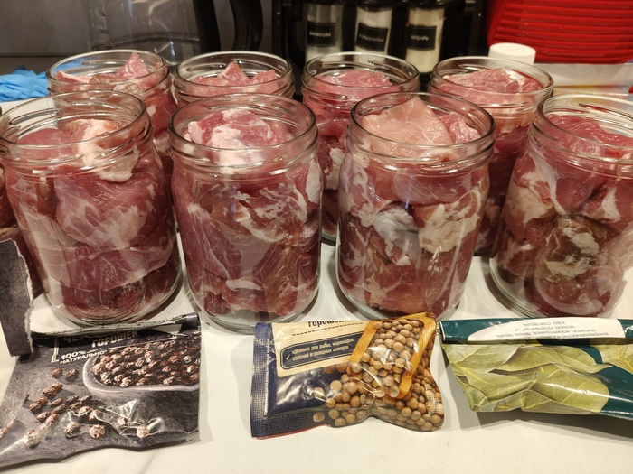 Дальше все просто - гречку смешать с обжаркой, грибами. В каждую банку добавить по паре горошин перца и 300 гр смеси, сверху свинины 150 и кусочек масла. Режим стерилизации пар, 115/115