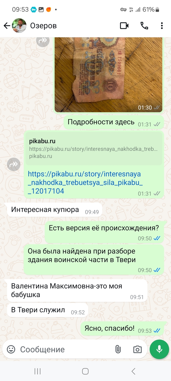 Всем доброго дня! Город Тверь, при ремонте пола в казарме воинской части, после вскрытия старых досок, обнаружили вот такую «капсулу времени» )) интересно было бы найти человека, который когда-то оставил там это послание на советском чирике ) поиск ВК по Белгороду выдал 3-х человек с таким именем и фамилией, но они не были в сети уже несколько лет. По номеру телефона тоже пробовали звонить, «номер не существует» (да, я знаю, что «0» в коде города нужно заменить на «4») Вадим Озеров (ну или вдруг кто его знает - нас же тут много), отзовись )