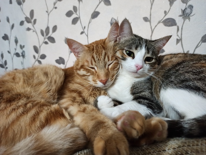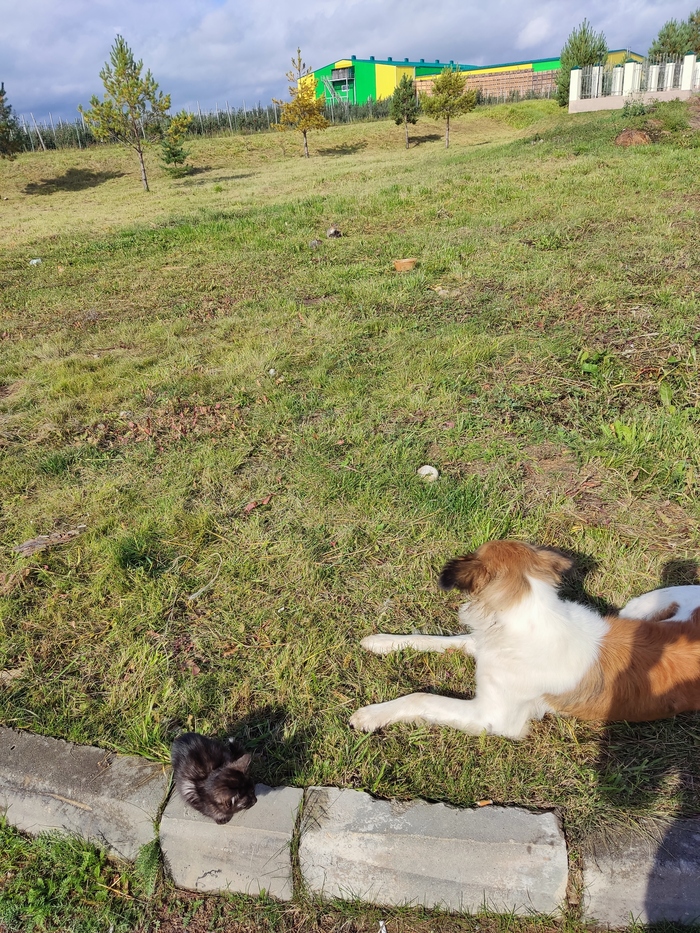 Сын подрабатывает в яблочном саду - собирают урожай. Рядом живут 14 кошек и собакен. Кошки облюбовали будку и псин вынужден ютиться вне своего домика. Самая дружелюбная - кошка, которую молодежь прозвала Алёной)