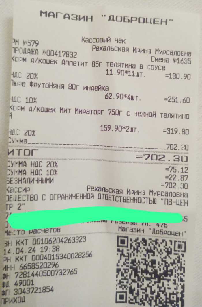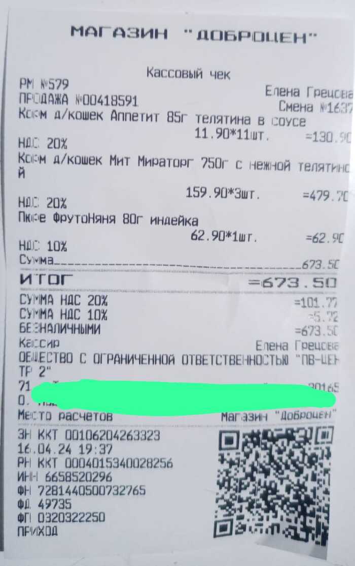 В доброцене было куплено 18.04.2023г два сухих корма,11 штук влажного корма,2 детских питания для котят