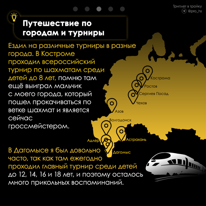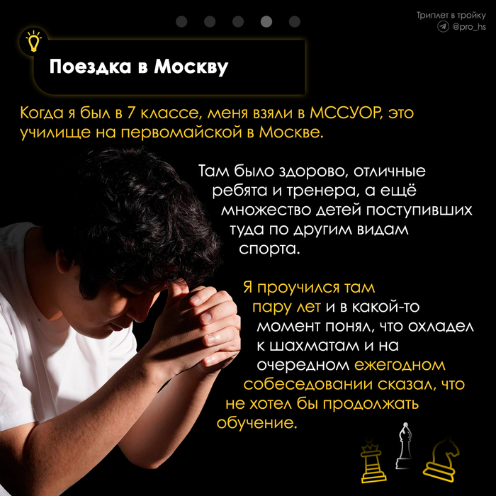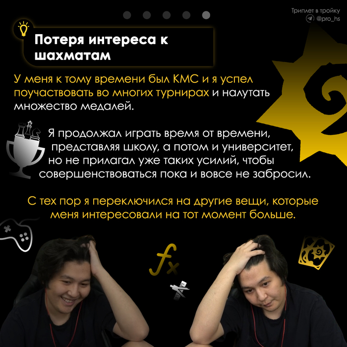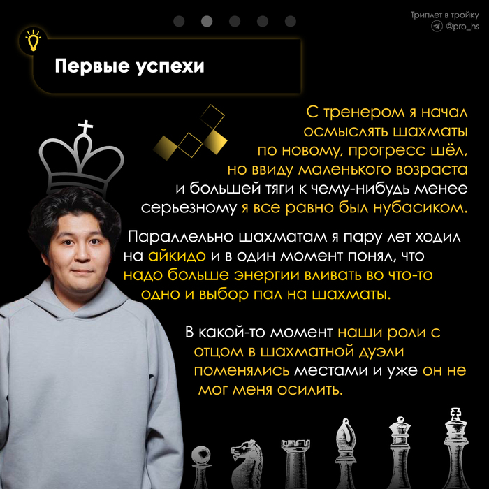 "На самом деле, многие недооценивают влияние шахмат на человека. Шахматы развивают в нас такие навыки как тактика, стратегия, логика и многое другое. Именно эти качества и пригодились Арслану в HS"