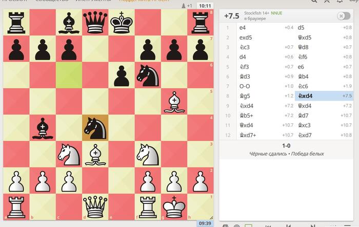 А вот на 8 ходу черные допускают грубейшую ошибку 8... Кd4 - типичное "пешкоедство" с потерей фигуры за пешку - и это будет для них лучший вариант. Как говорят в видеороликах - "поставьте видео на паузу"....