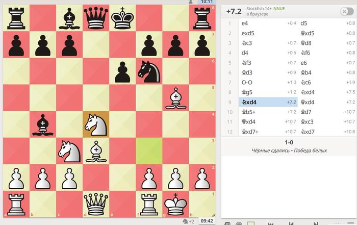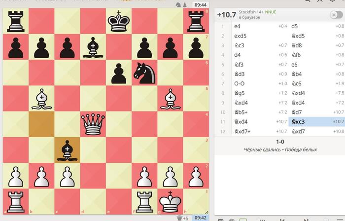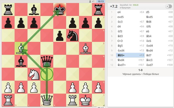 и как мы видим, черные полностью просчитываются в размене, т.к. следует 10... Сd7 - т.е. закрываются от шаха не ферзем, а слоном, теряют ферзя 11. Фd4 Cc3 - зачем то еще бьют коня и после 12. Сd7 Кd7 - сдаются.