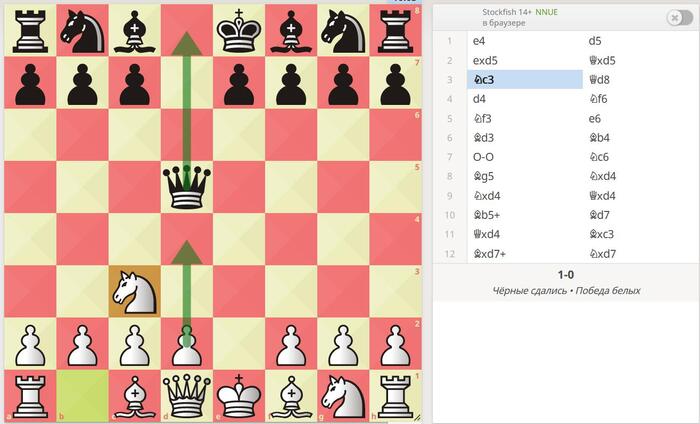 Итак, перед нами опять Скандинавская защита со стороны черных, о ней я уже рассказывал в предыдущих постах этой серии и современный вариант уход ферзя обратно на d8. Во многих учебных пособиях по шахматам утверждается, что скандинавская защита, не самый лучший дебют за черных. Дело в том, что после взятием ферзём пешки d5, белые выводят с темпом коня на с3. Ферзь вынужден уходить. Для желающих глубже изучить партию Александра Костенюк — Ромэйн Эдуард. Достаточно познавательная игра.