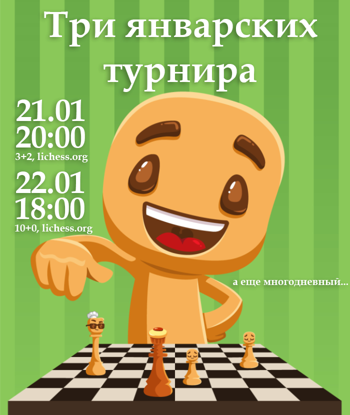 Суббота 21.01, 20:00, контроль 3+2, формат швейцарка. Длительность около полутора часов. Победители получат ачивки в профиль!