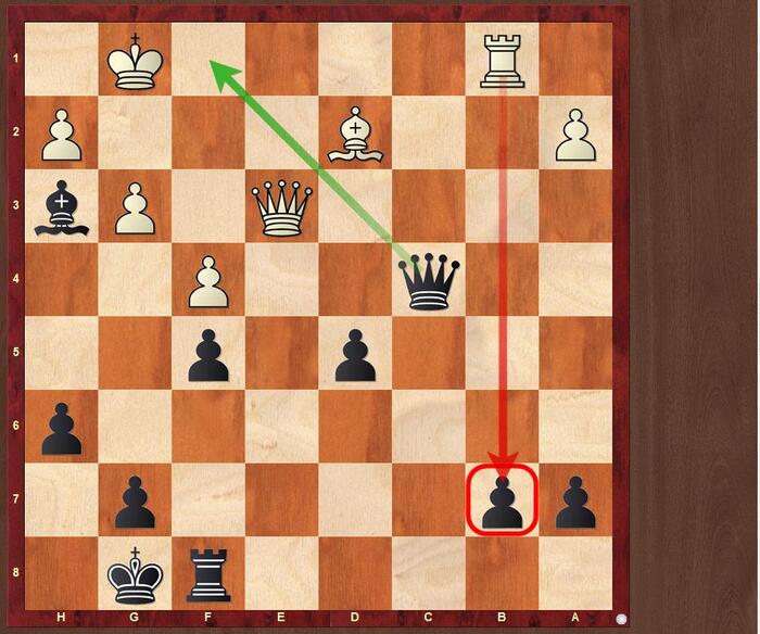 последовала бы примерно такая позиция и пешку на b7 брать нельзя, т.к. следует мат  Фf1 да конечно же у черных перевес, но таки не мат. Но тут соперник совершил еще один промах