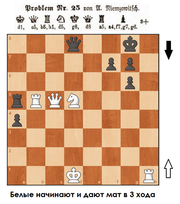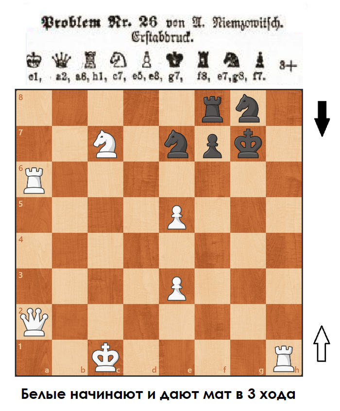 В рижской немецкоязычной газете "Baltische Zeitung" от 11 декабря 1918 годы в шахматном разделе были напечатаны две нижеприведённые композиции, составленные Ароном Исаевичем Нимцовичем (7.11.1886, Рига - 16.03.1935, Копенгаген), одним из крупнейших шахматистов и теоретиков шахмат в истории, претендентом на мировое первенство 1920—1930-х годов. Для достижения цели (мат чёрному королю) в обеих задачах белым разрешается сделать не более трёх ходов.