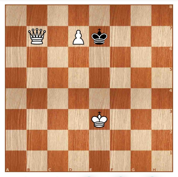 Играющий белыми держал в руках ферзя, но в таких случаях (а иногда проводят и третьего ферзя тоже),  во избежение потери времени необходимо останавливать часы и звать судью, который должен предоставить фигуру для превращения.