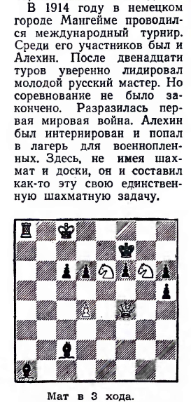 Согласно журналу "Наука и жизнь" за январь 1966 года это единственная шахматная задача Александра Алехина, причём составленная вслепую, то есть без шахматной доски и фигур.