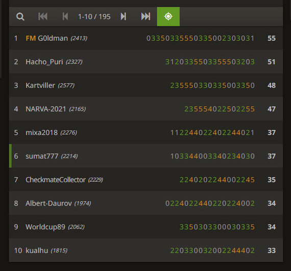 Я, sumat777, с трудом заполз в топовую десятку, занял в итоге 6 место, сильно отстав от победителей. Всего в турнире я сыграл 18 партий (+11 =1 -6). Мой рейтинг блиц в результате турнира снизился на 27 пунктов и теперь равняется 2214.
