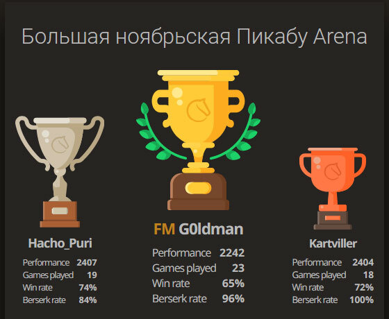 В пятницу вечером, 24.11.2023 прошел большой ноябрьский шахматный турнир, организованный порталом Пикабу. Система Арена, контроль 5+0, работают берсеки и премии за серии побед. В результате был выявлен сильнейший шахматист Пикабу. Им стал FM G0ldman (мастер ФИДЕ Александр Пискунов, Россия, Красноярск, Санкт-Петербург). Поздравляю победителя и привожу некоторую информацию по турниру.