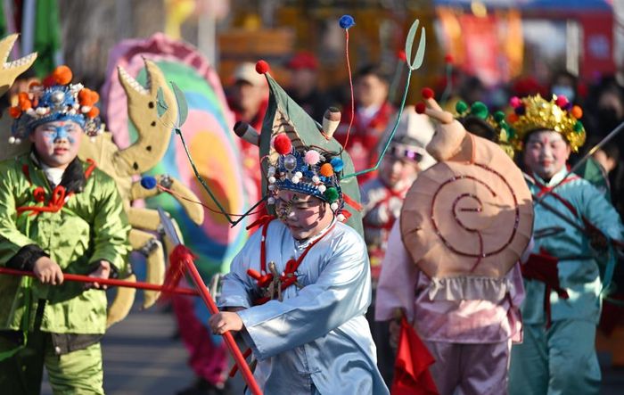 14 февраля /Синьхуа/ -- Местные жители в четверг наблюдали представление в ходе церемонии в честь китайской богини Мацзу в городе Тяньцзинь /Северный Китай/. (Фото: Синьхуа)