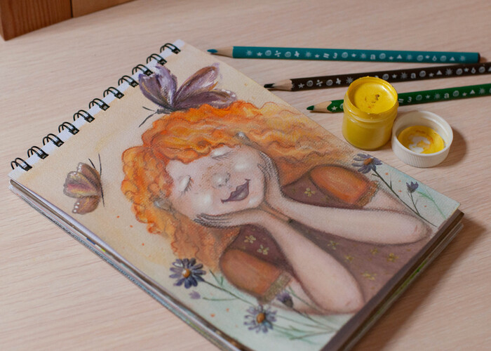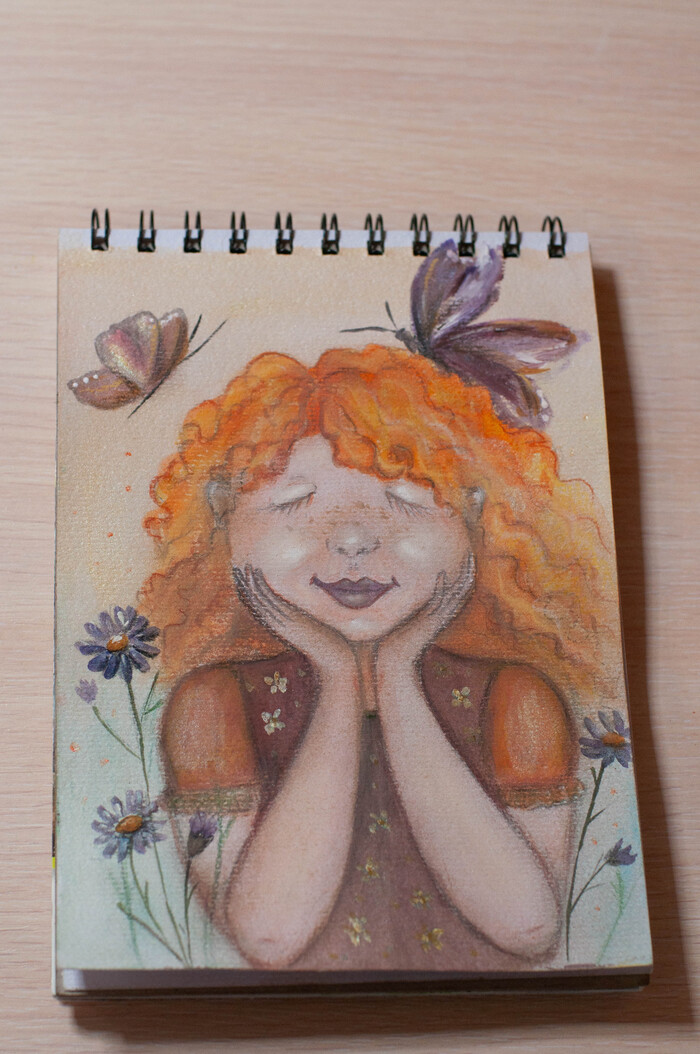 И уже готова солнечная девочка, с золотистыми рыжими кудрями и эффектными бабочками. Всем сердцем люблю теплую палитру и смешанную технику рисования.