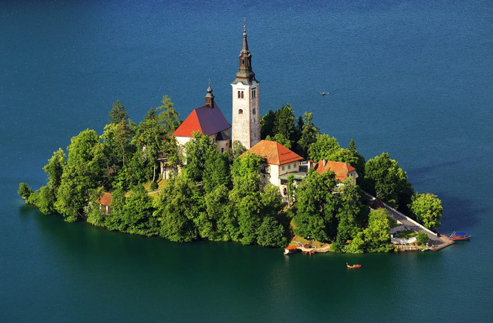 Церковь располагается на единственном острове во всей Словении. Чтобы попасть внутрь, необходимо переплыть озеро на лодке и подняться по 99 ступеням.