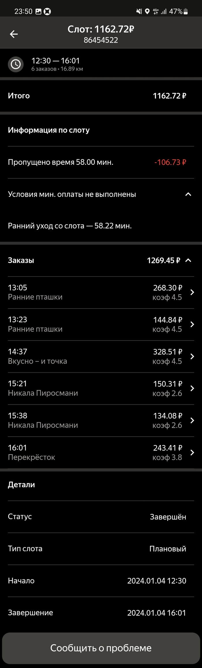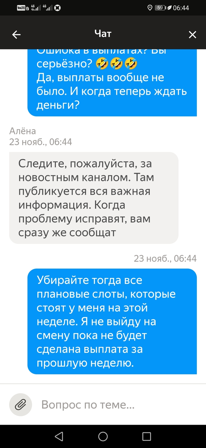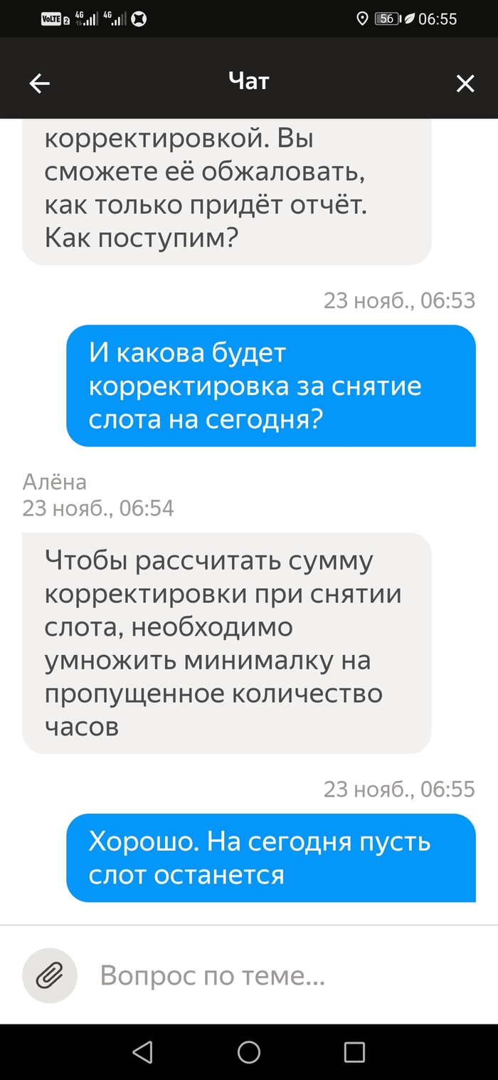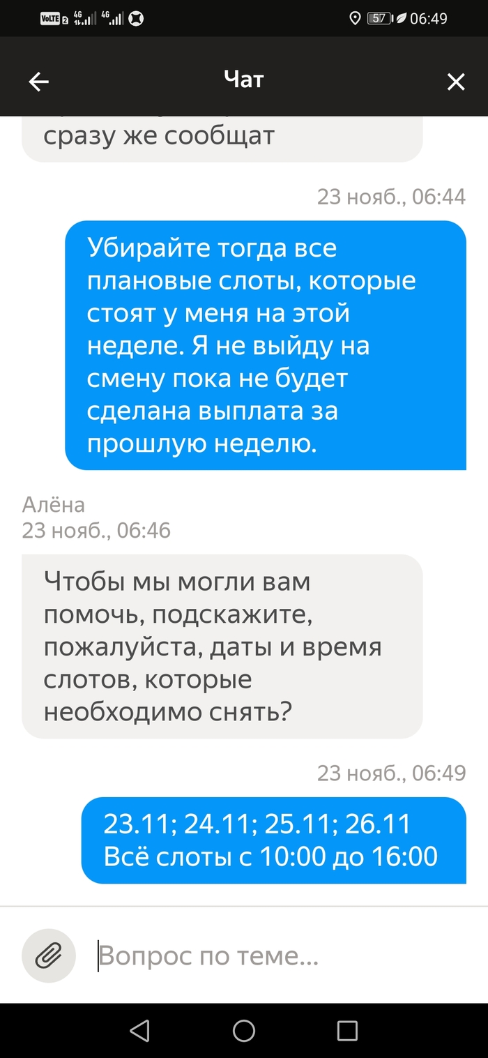 Подбесило это. Я написал им, что не выйду на плановые слоты пока не будет выплаты за прошлую неделю. В итоге 3 слота отменил сам, а один никак. Потому что отмена слота в тот же день когда стоит слот не возможна. Только через поддержку и с корректировкой. Которая считается как минималка в час умножанная на количество часов слота. Итого 150×6=900рублей за отмену слота день в день. И это 6-и часовой слот. А если больше?