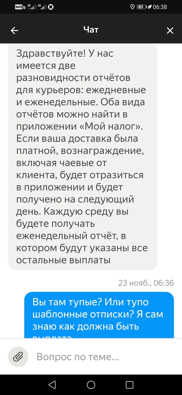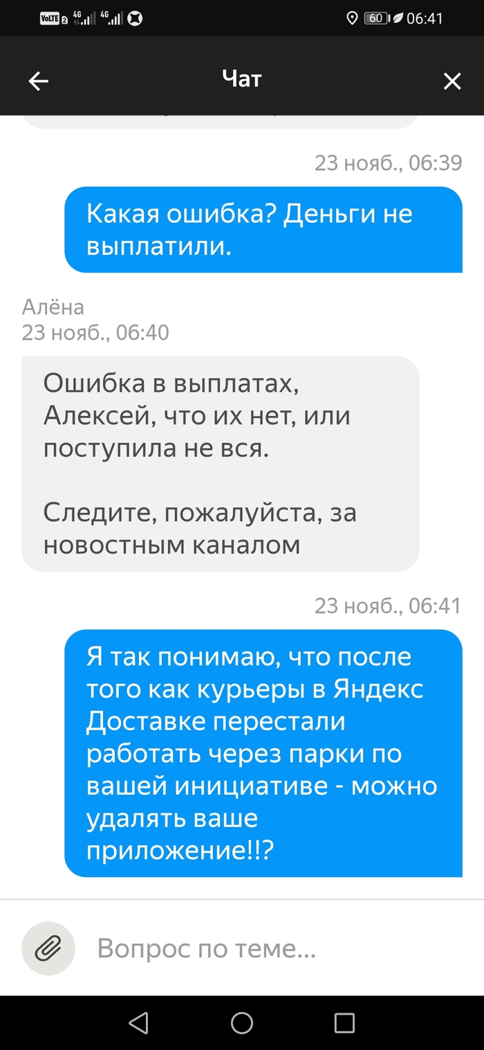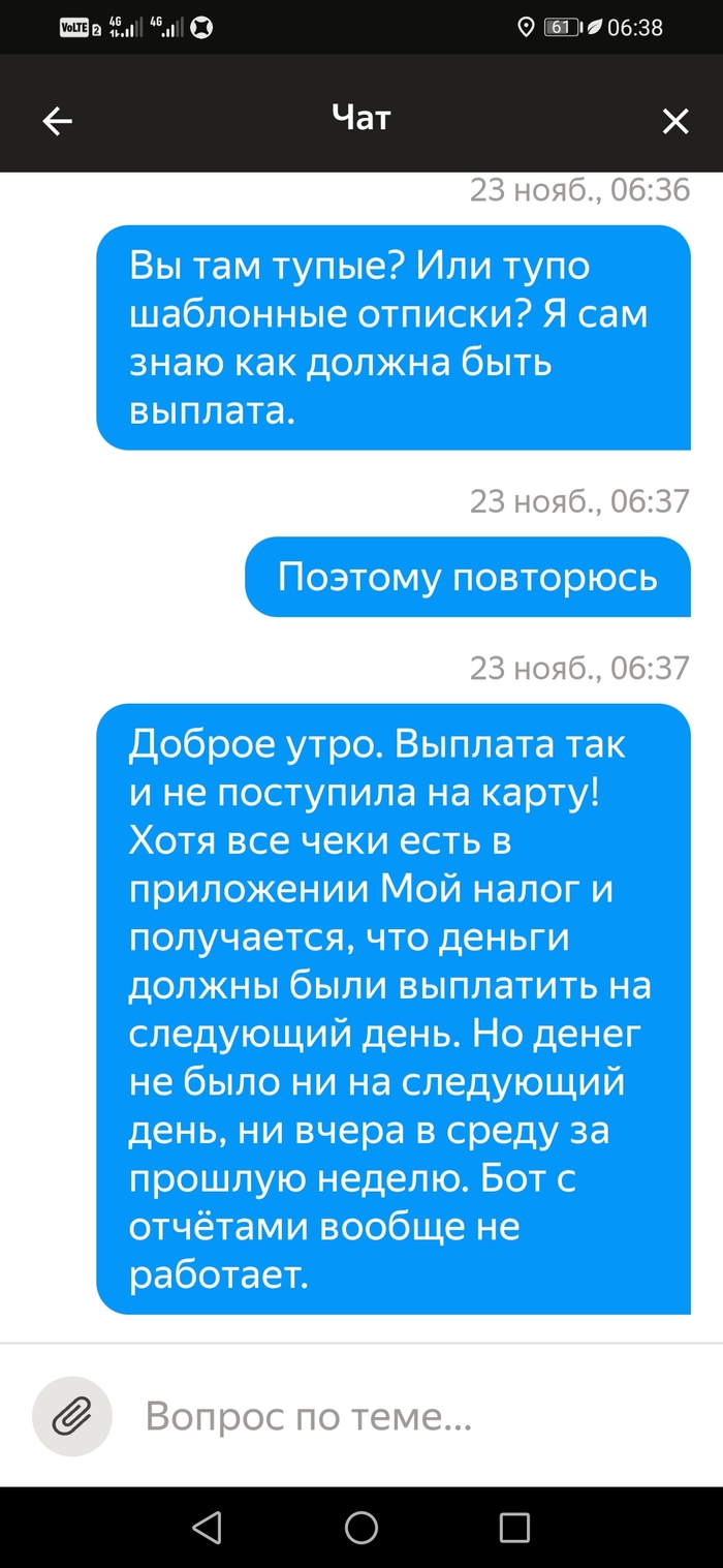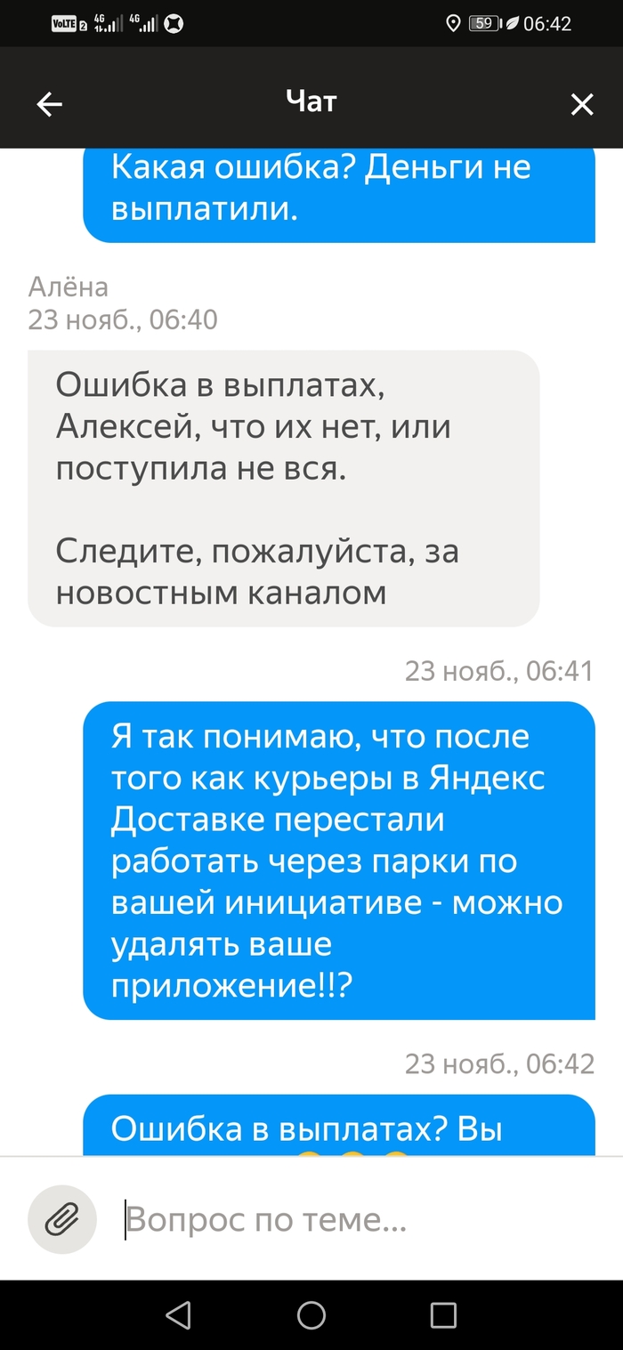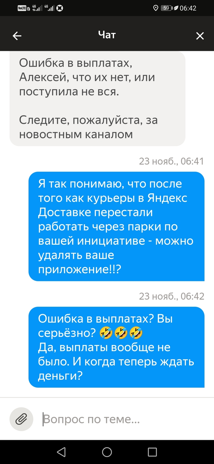 Подбесило это. Я написал им, что не выйду на плановые слоты пока не будет выплаты за прошлую неделю. В итоге 3 слота отменил сам, а один никак. Потому что отмена слота в тот же день когда стоит слот не возможна. Только через поддержку и с корректировкой. Которая считается как минималка в час умножанная на количество часов слота. Итого 150×6=900рублей за отмену слота день в день. И это 6-и часовой слот. А если больше?