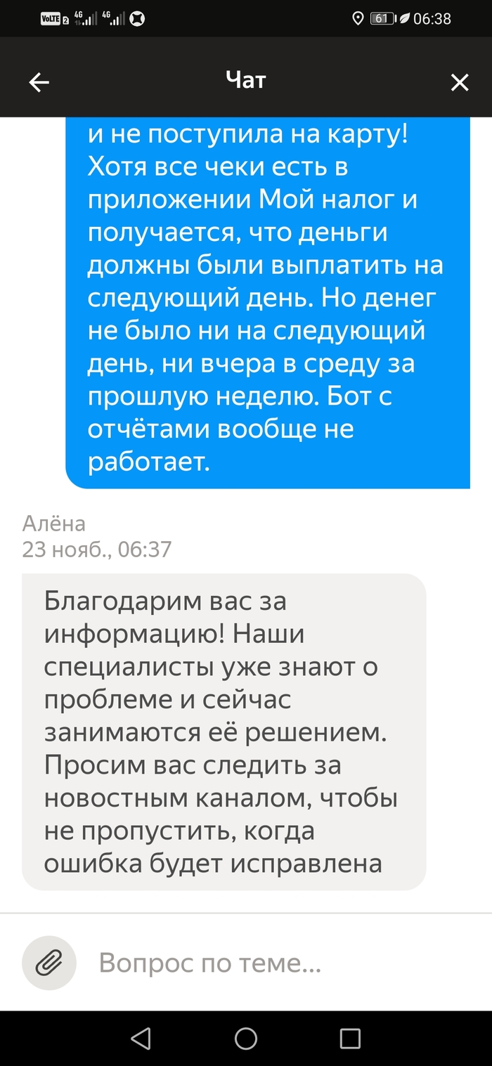А теперь самое интересное: чеки в мой налог есть, но на следующий день выплаты не было. Ок, жду среды. И что же? Среда - выплаты тоже нет! Поддержка пишет шаблонами. Ошибка в выплатах 🤣🤣🤣 Следите за новостями в приложении. Как всё исправят, то вам придёт сообщение.