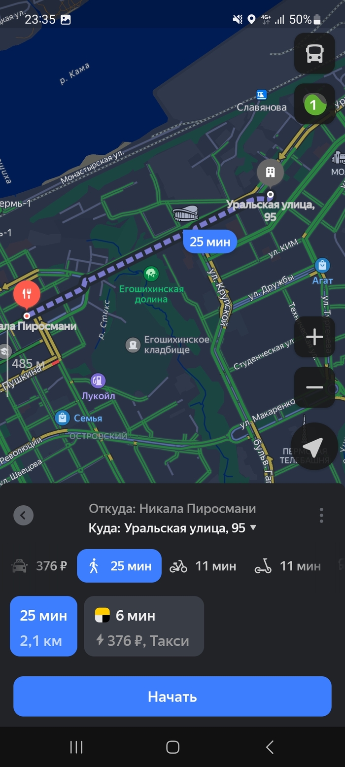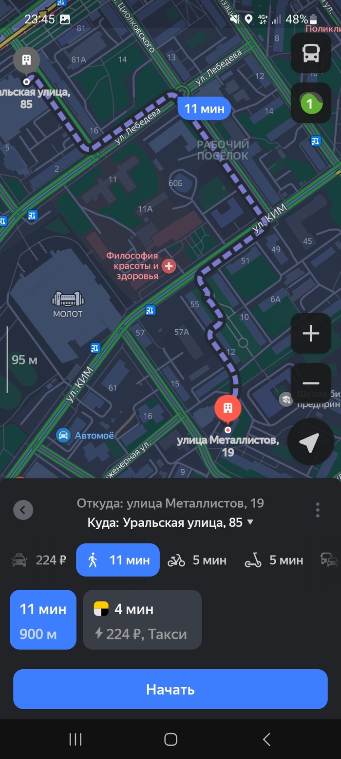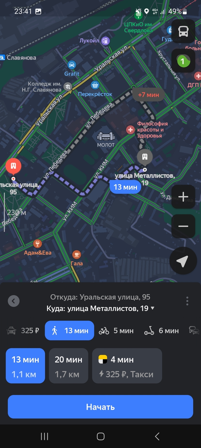 На радостях, что подача не дальняя, принимаю его. Далее, добавляется ещё одна точка, забирать оттуда же. Но, как известно, в любой бочке мёда обязательно будет ложка дёгтя. Смотрю, куда нужно эти помои везти и мягко говоря офигеваю. Сначала нужно привезти заказ в район сквера Новосёлова, а второй на ДКЖ. Это мне уже не нравится, поскольку оттуда запросто может унести на Парковый (привет, Лента), или ещё того хуже, на Светлый, где раньше был китайский рынок. Не люблю я тот район по очень простой причине, туда нет ни одного маршрута транспорта, пиздрячить нужно пешком, кругом стройка, в общем чёрт ногу сломит. Не представляю, как там вообще люди живут. Ну в общем отдав первый заказ, еду на ДКЖ. Вот маршрут от моей точки старта до ресторана: