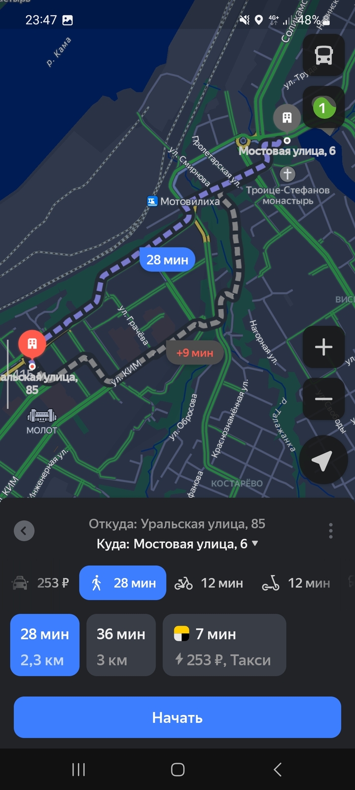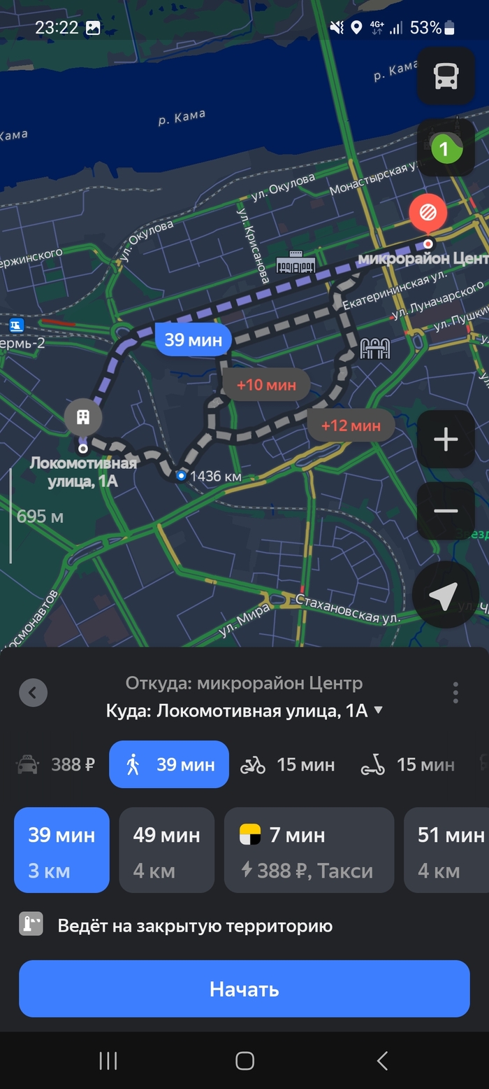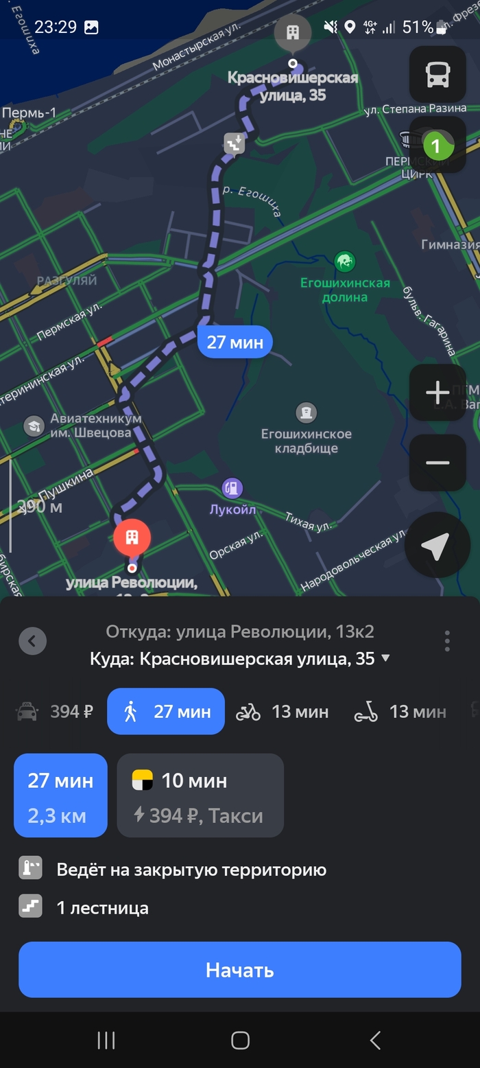 Ладно, беру. Но тут же приходит уведомление с конечным адресом. Увидев который, я уже начинаю бомбить. То есть из центра откидывает ещё глубже в Мотовилихинский район.