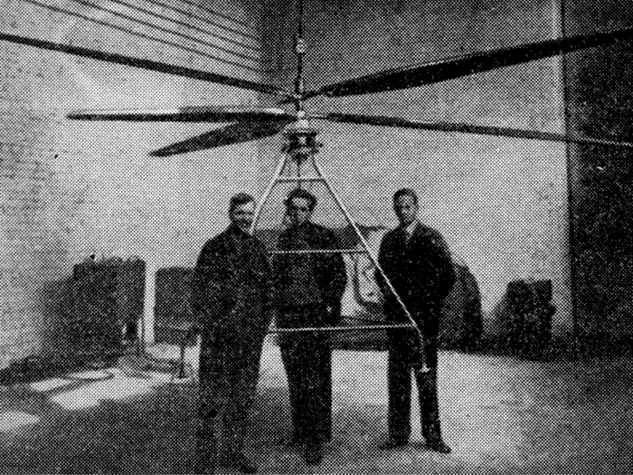 В начале 1937 года завершилась постройка модели привязного электро-вертолёта новой схемы. Модель имела трёхлопастной несущий винт, который приводился во вращение тягой небольших тянущих винтов, размещённых вместе с электродвигателями на конце каждой лопасти.
