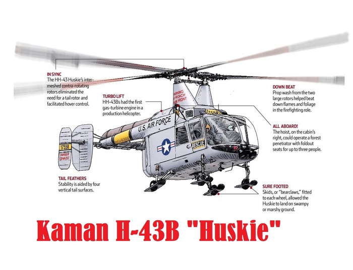 13 декабря 1958 года совершил свой первый полёт поисково-спасательный Kaman H-43B "Huskie" от компании "Kaman Aircraft Corporation". Данная модификация стала основной для вертолётов (синхроптеров) семейства "Huskie" - всего было построено 193 машины. Грузовая кабина была рассчитана на перевозку 8 пассажиров, а силовая установка включала ТВаД Avco Lycoming T53-L-1B мощностью 825 л.с. Также устанавливалась спасательная лебедка грузоподъёмностью 270 кг справа над сдвижной дверью или же противопожарное оборудование (Противопожарное оборудование включало резервуар емкостью 314 л, который транспортировался на внешней подвеске. При контакте с воздухом смесь расширялась, 314 л реагента превращались в пену объемом 2612 л. Масса груза на внешней подвеске ограничивалась 454 кг).