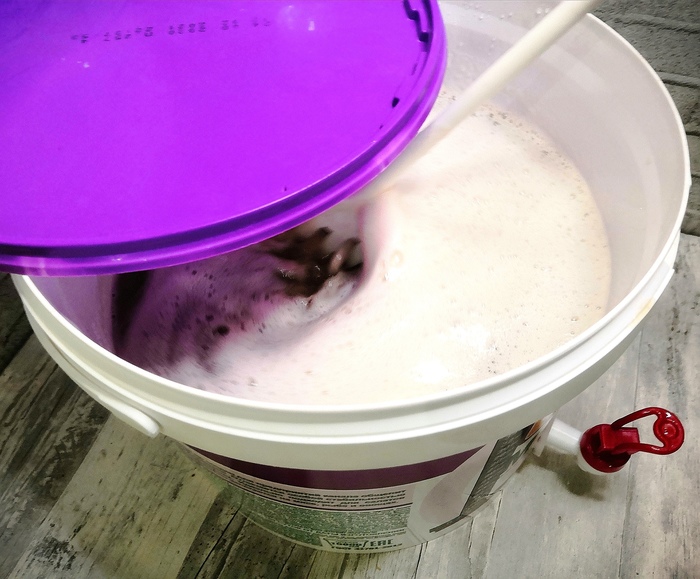 Через полчаса открываем крышку (белая пена это показатель того, что дрожжи начали работать), тщательно перемешиваем сусло и закрываем, поставив в тёмное место на 7 - 10 дней при комнатной температуре (20-25°С).