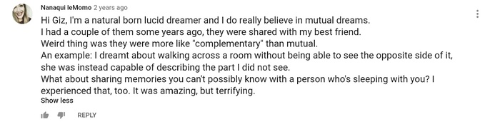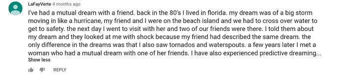 Несколько дней спустя я связался с человеком из своего сна, и он сказал, что недавно ему тоже приснился сон. Я попросил его рассказать мне о нем, и он пересказал мне мой же сон. Деталь за деталью. Вплоть до той части, где он пытался заставить меня искупаться в океане, а я отказался. Потом я так старался повторить это [совместный сон]. В первый раз это не было преднамеренно. И у меня никогда не было подобного опыта с тех пор. Это произошло 2 года назад, и я до сих пор не могу понять это.