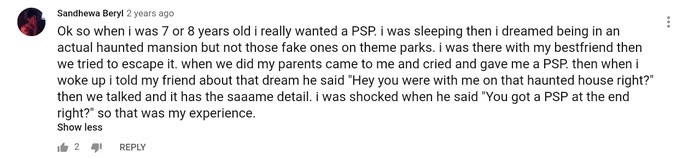 Итак, когда мне было 7 или 8 лет, я очень хотел PSP. Я спал, и мне снилось, что я оказался в настоящем особняке с привидениями, но не в тех постановочных, как в тематических парках. Я был там с моим лучшим другом, и мы вместе пытались оттуда сбежать. Когда нам это удалось, ко мне пришли мои родители, они плакали и дали мне PSP. Затем, когда я проснулся, я рассказал своему другу об этом сне. Он сказал: "Эй, ты был со мной в этом доме с привидениями, верно?" Тогда мы поговорили, и оказалось, что в его сне были те же детали. Я был шокирован, когда он сказал: «Тебе дали PSP в конце, верно?» Вот такой у меня был опыт.