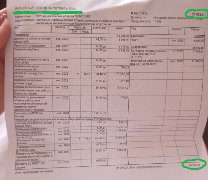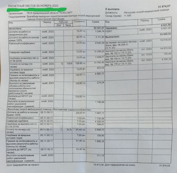 Обращается к Вам средний медицинский персонал скорой медицинской помощи из городов Архангельска и Новодвинска Архангельской области. Доводим до Вашего сведения, что наша реальная заработная плата не соответствует указу Президента РФ от 07.05.2012 года № 597. Доплата до средних показателей зарплаты по региону была произведена лишь врачам ГБУЗ АО «АОКССМП» в октябре и декабре 2023 года. Среднему медицинскому персоналу данная доплата не производилась. По данным Росстата среднемесячная номинальная начисленная заработная плата по региону на октябрь 2023 года составляет 70 808,6 (семьдесят тысяч восемьсот восемь шесть десятых) рублей. Однако зарплата сотрудников среднего медицинского звена, работающих в организации ровно на одну ставку по основному трудовому договору, составляет от 27000 (двадцати семи тысяч) рублей до 39 000 (тридцати девяти тысяч) рублей в зависимости от квалификационных категорий и трудового стажа. Оклад фельдшера в организации всего лишь 11 685 (одиннадцать тысяч шестьсот восемьдесят пять) рублей.