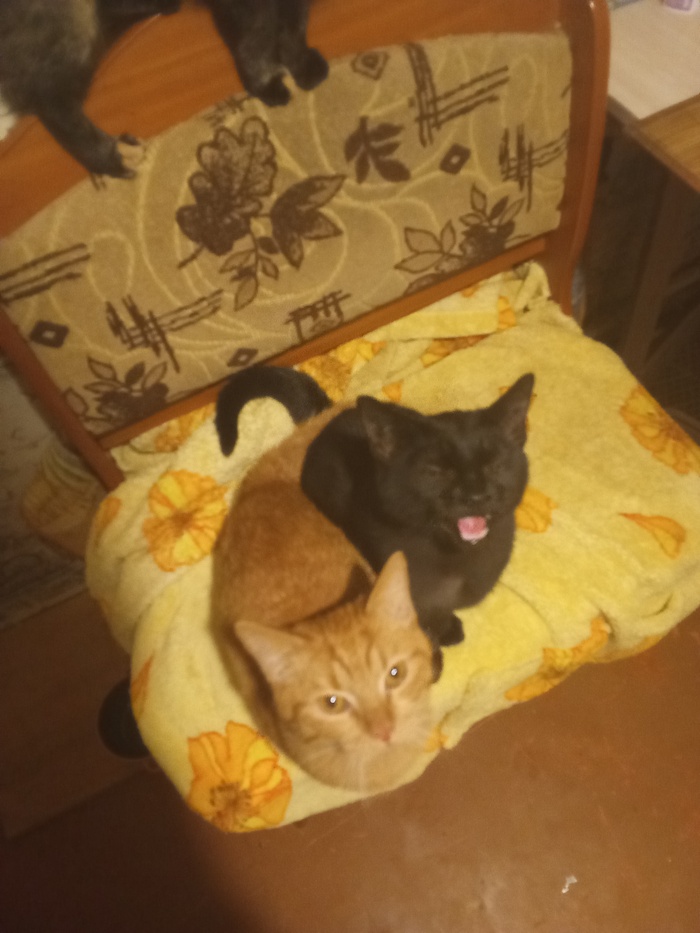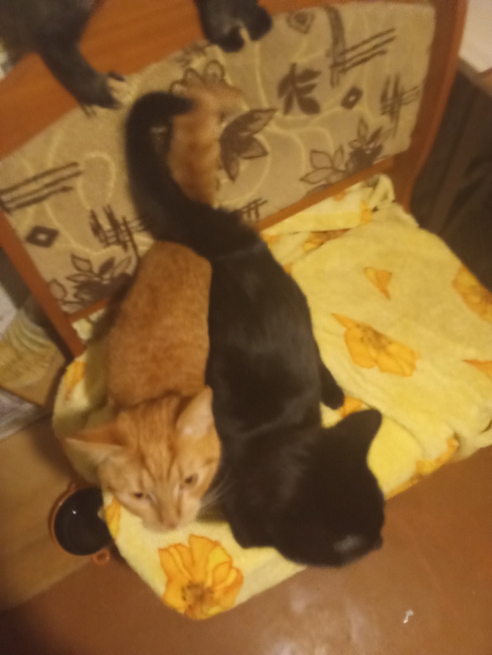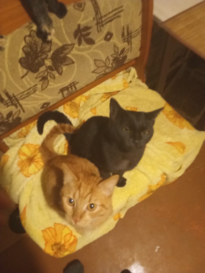 Котятам по шесть месяцев (рыжий и черный) , черно - белый три месяца , он подобран мной по дурости из подъезда комплектом.