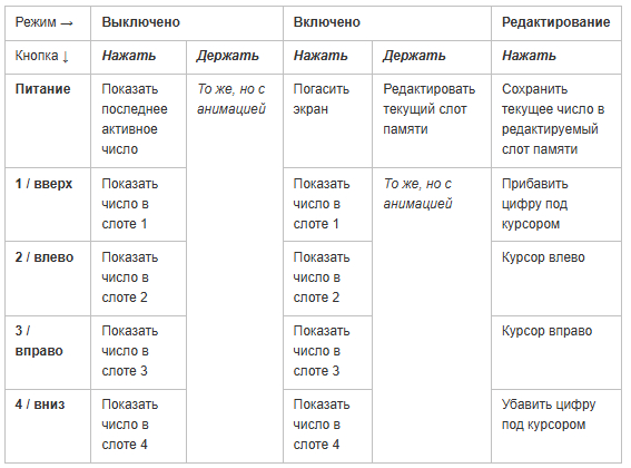 Восьмибитный выход с регистра разбивается по полубайтам на два дешифратора MC14028. У каждого дешифратора есть четырёхбитный вход и 10 выходов. Если двоичное значение на входе попадает в десятичный диапазон от 0 до 9, то на соответствующем выходе из Q0-Q9 появится высокий логический уровень, в противном же случае — все выходы останутся на низком уровне. Можно представить эту логику в виде таблицы истинности: