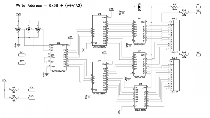 Например, если мы запишем в регистр PCF8574 шестнадцатеричное число 0x28 — первые (старшие) 4 бита уйдут на верхний по схеме дешифратор (U8) и включат у него выход под номером 2, вторые (младшие) 4 бита уйдут на нижний дешифратор (U7) и включат у него выход под номером 8.