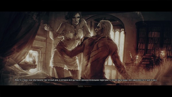 Скрипнувшая внизу дверь прервала воспоминания. В небольшой гостинной этажом ниже что-то упало на пол и послышалась сдавленная ругань. Трисс, проживя несколько лет в окружении запахов ведьмачьего дела, безошибочно определила - утопцы. Через минуту и сам ведьмак, распахнув дверь, упал на диван, шипя и держась за плечо