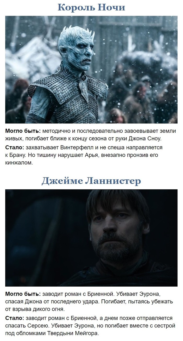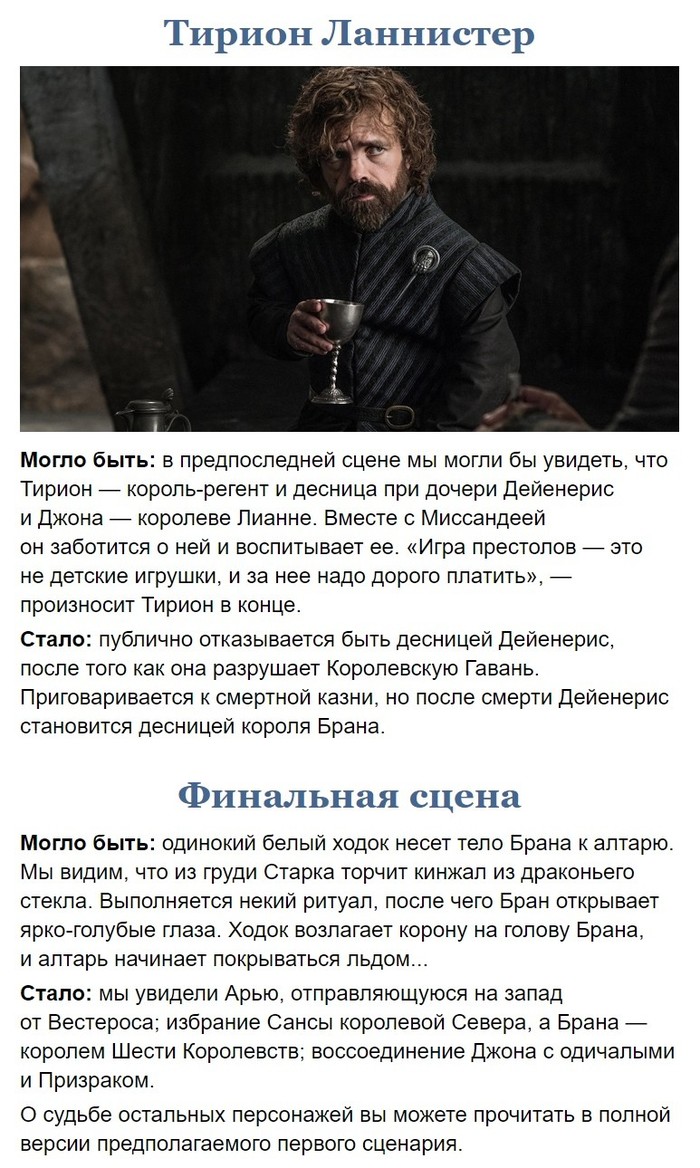 Уже и так очень много написала. В общем все заканчивается тем что бран всех рассорил пощадив мизинца и сказав ему что джон таргариан, и в итоге они все поубивали друг друга и попредовали, дени свихнулась после всех этих предательств в борьбе за власть, отправной точкой служит казнь сансы за измену короне, после чего джон уже не может простить дени да она и не горит желанием просить прошения. Ну а дальше можно ещё хоть миллион сезонов запилить( так ка ИП бесконечна, кто бы не оказался на троне) в итоге не остаётся никого кроме Брана, арьи, тириона, олены, джона, Сэма ну и ещё некоторых второстепенных персонажей. Джон отрекается от престола и его делают хранителем севера, ну а бран так тихо подкатывает к власти на своей коляске, все понимают что лучше пусть будет он королем чем какой-либо эгоистичный фанатик и чтобы королевство которое находиться в плачевном состоянии не разрушилось до конца лучше пусть правит колека который все время в прошлом, давая волю лордам принимать решения.
