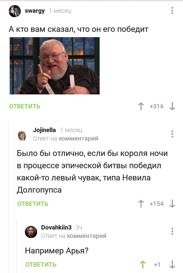 Если вам реально печёт (я не знаю, мож это просто ради мемасов столько постов, но что-то много подрывов вижу) с того, как убили драконов, как убили КН, как Серсея не расстреляла всех на переговорах, просто представьте, что это плохая экранизация или условности из-за ограничений сериала и попила бюджета, если угодно.