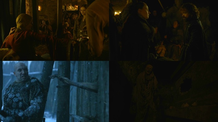 На крепостной стене что-то забыла Санса которая никогда не брала оружия в руки. Перед тем как Арье наконец удается ее спровадить куда подальше (то есть в крипту к остальному небоеспособному населению) та несет какую-то чушь о том что не бросит "своих" людей. Рыжая всего-то заменяла Джона на троне пока он был в отъезде. После его возвращения Хранителем Севера она не имеет никакой власти. В военном деле Санса не понимает вообще ничего. Перед Битвой Бастардов она это прекрасно знала. Напоследок сестра вручает ей нож из обсидиана. Хотя стоило вооружить не только ее, но и еще пару человек в крипте на случай худшего. Там пока идет битва рыжая предается унылым разговорам с бывшим или текущим (нам так и не прояснили этот нюанс) мужем. Эта сцена пародирует аналогичную во время сражения у Черноводной. Вот только в тех диалогах был смысл, а тут нет. Запоминается только внезапно вставленное Миссандеей "Без драконьей королевы мы бы уже погибли." Это когда без помощи Дейнерис Король Ночи куковал бы за Стеной еще 8000 лет. Когда мертвецы прорываются во двор и ломятся в крипту они не могут сломать дверь хотя ранее неоднократно пробивали дерево. Зато иссохшие древние трупы Старков без проблем крушат каменные саркофаги и лезут наружу. Да и зачем вообще была нужна эта сцена если никто значимый не погибает? Чтобы намекнуть на развитие взаимной симпатии между карликом и его женой?