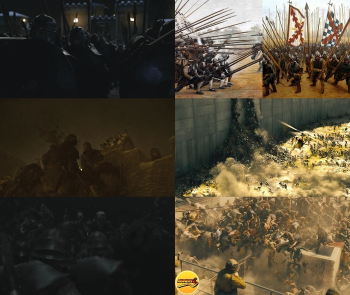Катапульты с требушетами поставили не на стены замка или хотя бы за рвом, а впереди всего войска. Все чтобы они оказались наиболее бесполезны. За ними в середине встали евнухи со щитами и копьями снабженными обсидиановыми наконечниками. Вот только они не знают как правильно их использовать чтобы максимально навредить врагу. Впрочем Безупречные-это самая дисциплинированная и более-менее нормально экипированная часть войска. Проигрывают они потому что понятия не имеют о строе+мертвецы читерят. Зомбаки вдруг научились летать и наваливаются на них целой горой. А позже устроив кучу-малу забираются на стены Винтерфелла. Сие ни что иное как извращенный плагиат на фильм "Мировая война Z". На фоне евнухов остальные просто клоуны. Битва Бастардов ничему не научила одичалых и они пошли в бой без щитов с предсказуемым результатом. Разношерстная толпа справа и слева от евнухов понятия не имеет о строе и дисциплине. Бриенна назначенная командовать третью армии лезет в первый ряд. Впрочем тут ничего удивительного, ведь у нее нет военного и командирского опыта. Своим назначением она обязана пустоголовой Сансе куда-то девшей нормального полководца-Ройса. И где конница Долины? Что в первом ряду забыли Сэм и инвалид Джейме тоже не объясняют. Первый драться вообще не умеет и у него один ножик. Ланнистер же левой рукой сражается не очень хорошо. В прошлой битве его пришлось спасать Дикону. Самое же смешное что эти два наиболее уязвимых "бойца" выживают среди орд зомбаков. Это даже не сюжетная броня, а откровенный треш. Хотя учитывая волну зомби все стоящие в первых рядах должны были погибнуть. Джейме умудряется не только отбиваться от мертвецов, но и спасти Бриенну. Сэма с фатальными для себя последствиями выручает Эдд. Мертвецы деликатно обходят стороной персонажей у которых в гуще битвы происходят вот такие вот сцены.