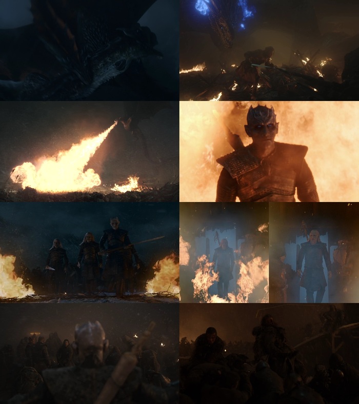 Наконец финальный слив всего сериала. 7 сезонов нам рисовали чудовищную угрозу иных чтобы получился жалкий пшик. Но этого беннивайсам показалось мало-они попутно слили все пророчества и намеки в угоду собственным выдумкам. Джон пытается нагнать Короля Ночи плюнув на спасения Сэма. Верный ход-Сноу в этой сцене впервые правильно расставил приоритеты. Даже толпы тупых ботов мертвецов не могут остановить нашего Марти Стю. Но тут его тормозит зомбодракон поливая огнем направо и налево. В самый драматичный момент Сноу решает покончить жизнь самоубийством подставившись под пламя ящера. Тем временем все железяне и надо полагать Алис Карстарк (не показали ее смерть) сливаются. В живых остается один Теон который потратив все стрелы обнаруживает себя безоружным, но быстро подбирает копье погибшего соотечественника. Им он трешево убивает кучу зомби пока не приходит Король Ночи. К которому только сейчас присоединилась чертова дюжина ходоков. Подбодренный Браном Теон совершает совершенно бессмысленное самоубийство кидаясь с одним копьем на главу ледышек. Вокруг полно мертвецов, а рядом с Королем Ночи ходоки. Почему бы им всем не накинутся и быстро прикончить Брана? Отчего главгад должен обязательно сам убить зеленовидца? Ответа нет и не будет. Грейджой умирает самым нелепым образом-Король Ночи протыкает его обломком копья сквозь доспех! Не важно насколько силен злодей-дерево не пробьет выверенную кожу и металл. Ходок подходит к Брану и тянется за оружием чтобы его зарубить. Играет музыка, мелькают кадры со всеми героями которые вот-вот погибнут. И происходит самый бездарный слив из возможных. Арья телепортируется через толпу зомби и иных, но Король Ночи ловит ее в прыжке. Вот только убивашка выпускает кинжал и поймав его другой рукой убивает главного злодея сериала. При этом ничто не мешало ходоку просто приложить свою нечеловеческую силу и раздавить Арье шею.
