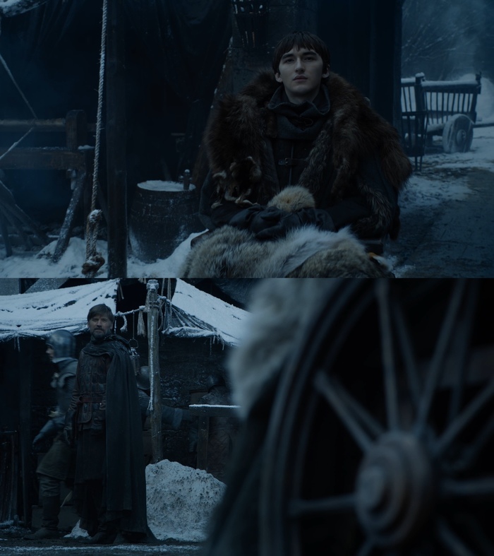 В заключительной сцене Джейме Ланнистер прибывает в Винтерфелл. Он перекрасил русые кудри в оттенок "морозный каштан", чтобы его не опознали (а золотой протез заменил на деревянный). Маскировка ему не помогла: первым, кого он встретил в крепости, стал подросший Бран, сумрачно глядящий на него из инвалидной коляски. Судя по выражению лица Джейме, у него под краской челка поседела.