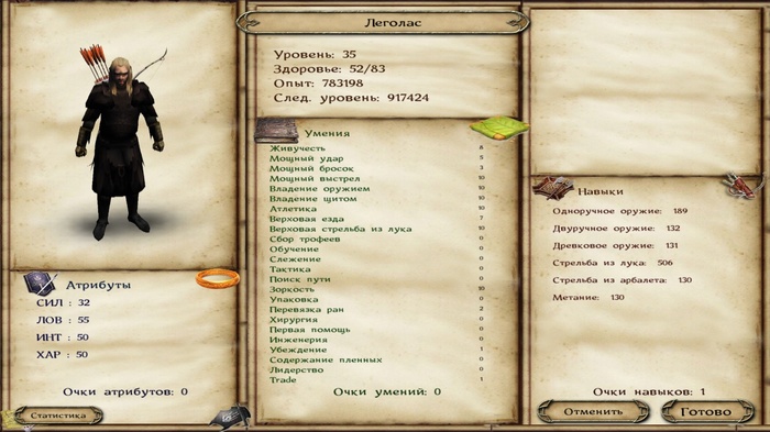 Навыки здесь достаточно стандартны: сила, ловкость и красноречие Но братство кольца не единственные герои: в игре присутствуют фактически все ключевые персонажи вселенной Толкиена: в странствиях вы можете наткнуться на Луртза, Эомера, Эльронда или Траина, владеющих городами и путешествующих с отрядами не меньше 50 человек. Но не всем “героям” так повезло: на бескрайних просторах Средиземья вы можете встретить Беорна, Радагаста, Эовин и много кого еще, не имеющих собственных наделов земли, но готовых за умеренную плату присоединиться к вашему войску.